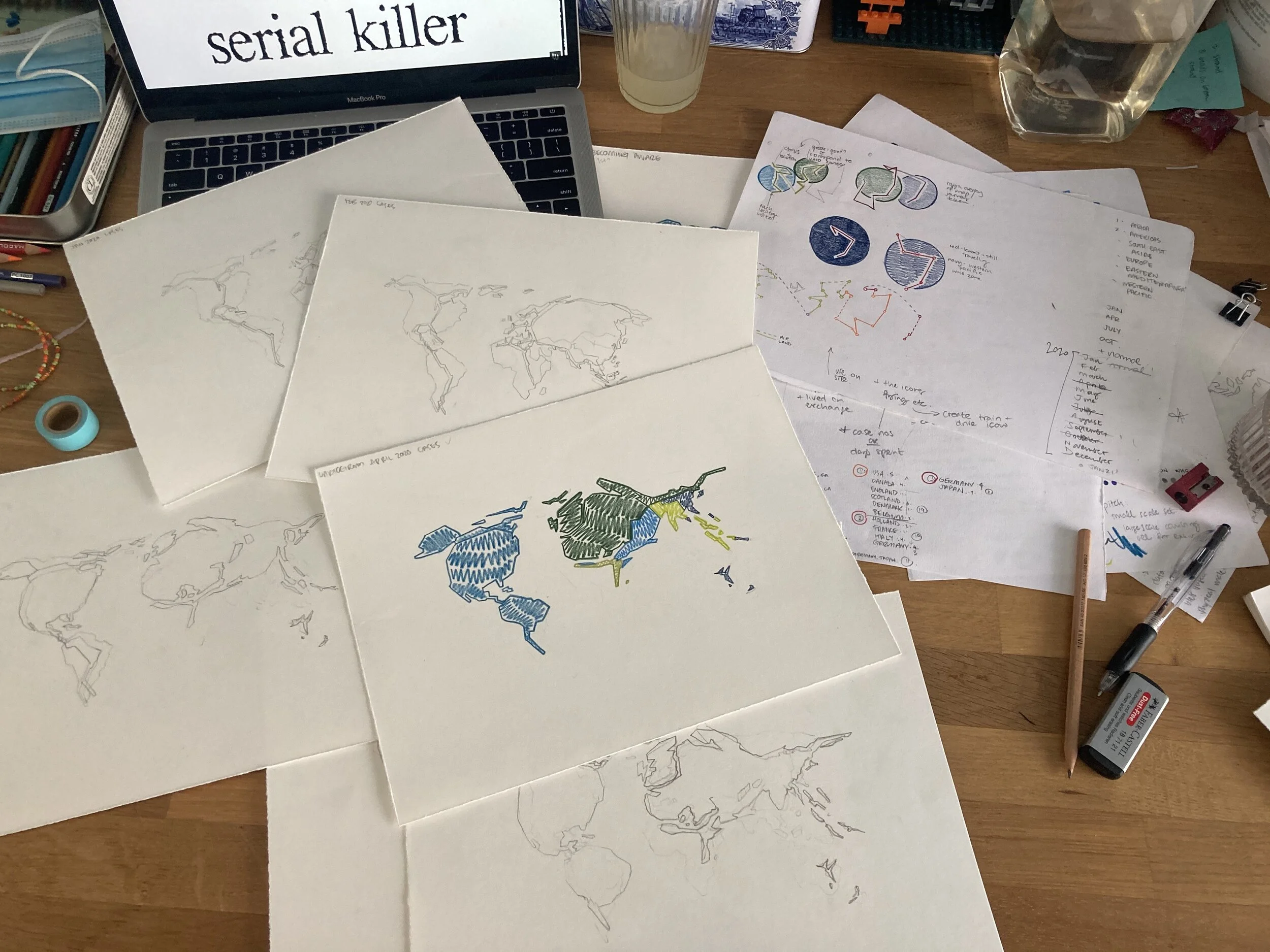 The project, at this stage, serves in part as a proof of concept and in part as a design/install proposal. The work begins with a map telling my personal story of the emerging pandemic. In semester two of 2019 I undertook an international exchange program to the University of Dundee in Scotland. Leading up to the exchange program, in July 2019, I visited the US, Canada and the UK. After concluding my studies in Scotland I toured a lot of Europe, coincidentally many of the countries hardest hit by the pandemic; Italy and Germany, for example, before coming back to Australia via Japan in February 2020.